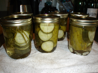 They’re done at this point and labeled, and now I just need the jars to cool before I can put ’em in the "root cellar" for awhile. In a couple of weeks, I’ll open a jar and see whether they’re inedible, ho-hum, or an excellent substitute for my PCC pickle obsession!